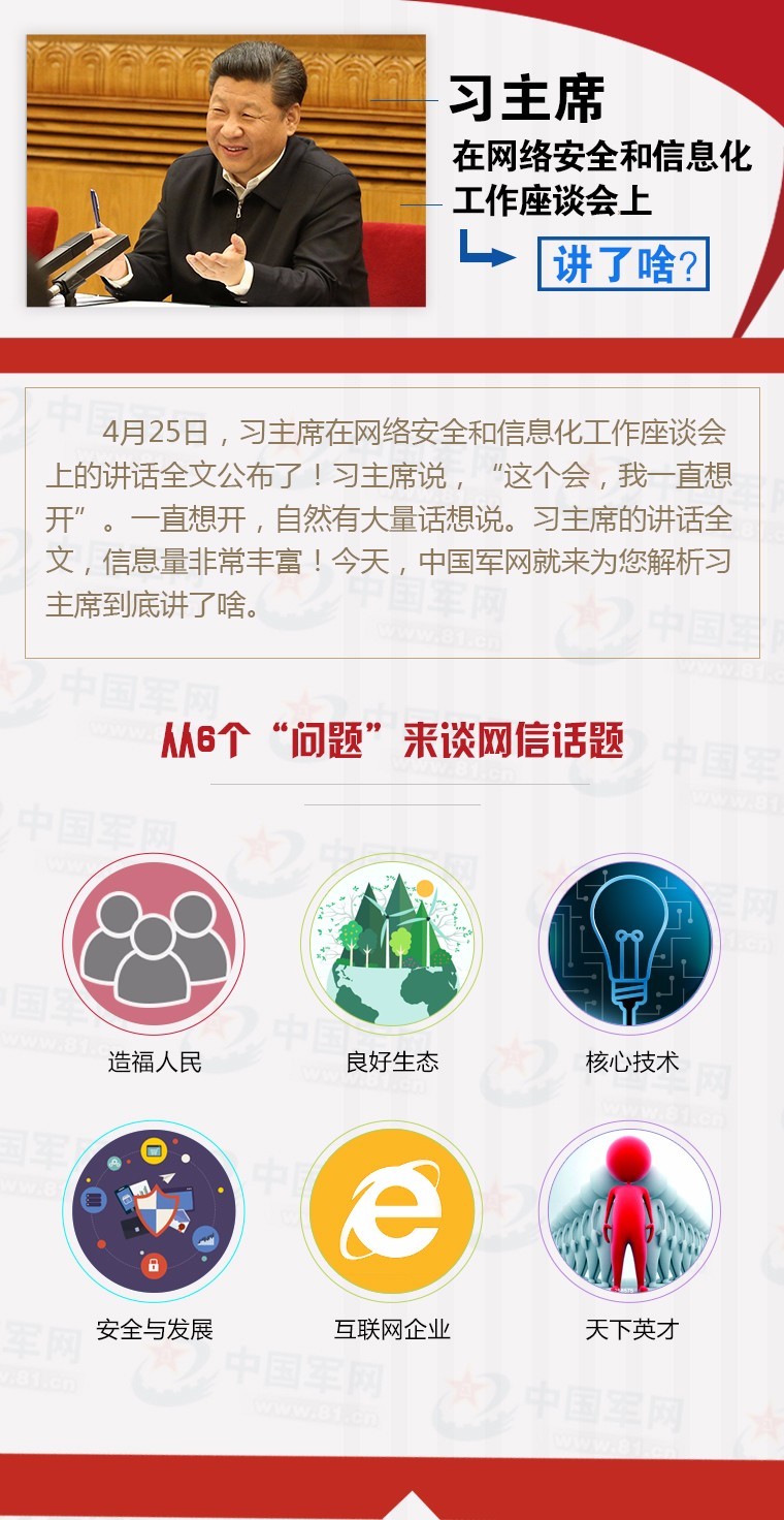 4月25日,習(xí)主席在網(wǎng)絡(luò)安全和信息化工作座談會上的講話公布了!習(xí)主席說,“這個會,我一直想開”。一直想開,自然有大量話想說。習(xí)主席的講話全文,信息量非常豐富!今天,軍報帶你一圖讀懂習(xí)主席在網(wǎng)信工作座談會上的講話全文。