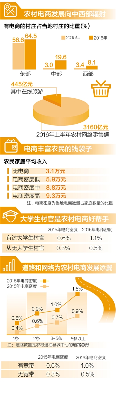 數(shù)據(jù)顯示:有寬帶村莊的電商密度是無寬帶村莊的2倍;與最多只有一條道路的村莊相比,多條道路可提高農(nóng)民家庭收入1.23萬元。