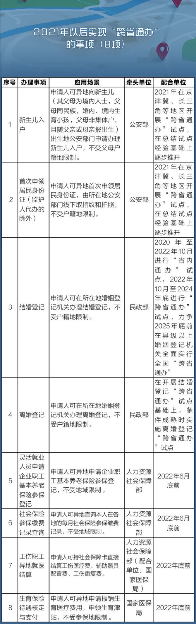 日前,國務(wù)院辦公廳印發(fā)《關(guān)于加快推進(jìn)政務(wù)服務(wù)“跨省通辦”的指導(dǎo)意見》,對140項(xiàng)高頻政務(wù)服務(wù)事項(xiàng)“跨省通辦”給出具體時(shí)間表、路線圖,一起來看!
