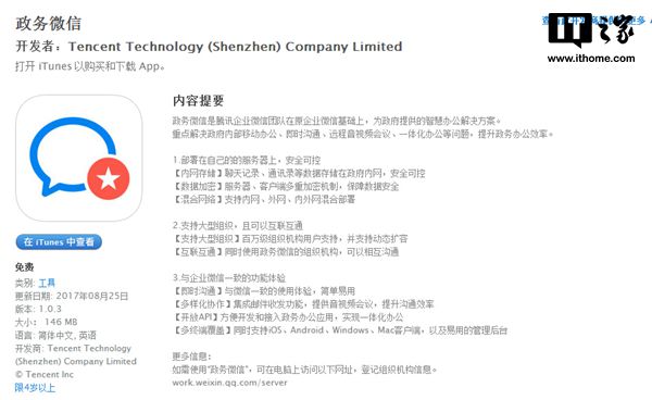 微信是目前在國內(nèi)最火的移動端社交軟件,與QQ相比微信并不太樂衷為不同需求的用戶定制不同的軟件版本,此前也只推出過企業(yè)微信供企業(yè)使用,據(jù)IT之家網(wǎng)友爆料,昨天下午微信官方在蘋果App Store上上線了政務(wù)微信App,主要用于政府市場。